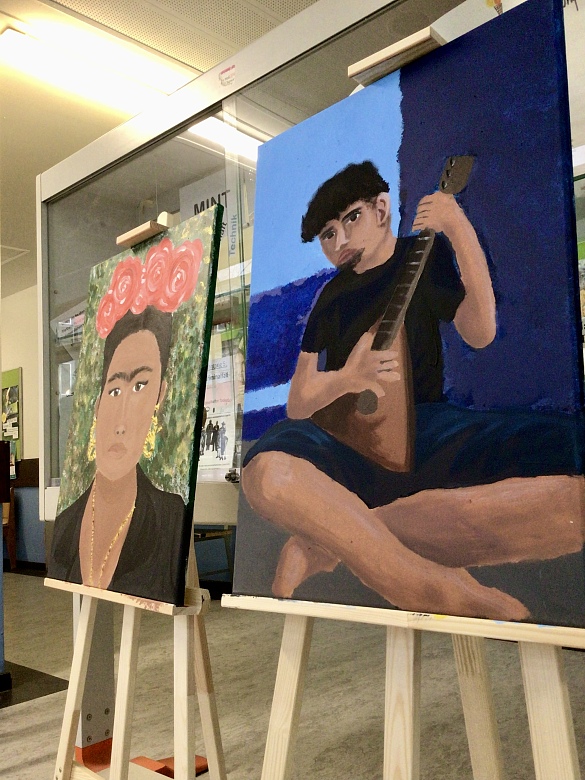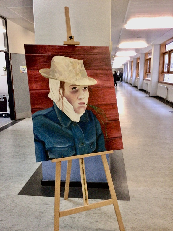 Grundlage für ihre praktische Arbeit. Dem Vorbild der Künstlerin Cindy Sherman folgend bearbeiten die SuS ein selbst gewähltes historisches, indem sie es es für sich neu, frei und kreativ, interpretierten und die Ergebnisse als Selbstporträt fotografisch visualisierten. Im weiteren Schritt fertigten sie ein analoges Werk: ein 80x100cm großes Selbstbildnis auf Keilrahmen.