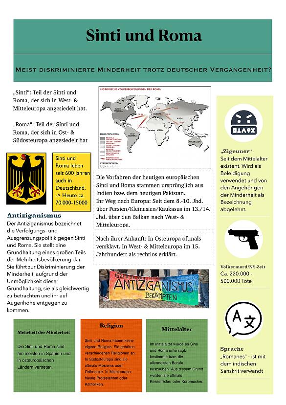 Im Rahmen dieses Projektes haben wir uns mit dem Thema Antiziganismus beschäftigt und vor allem die historische Dimension beleuchtet. Die Verfolgung und Diskriminierung gegenüber Sinti und Roma durch nichtstaatliche und staatliche Maßnahmen reicht weit in die Geschichte zurück. Hier unsere Projektprodukte.