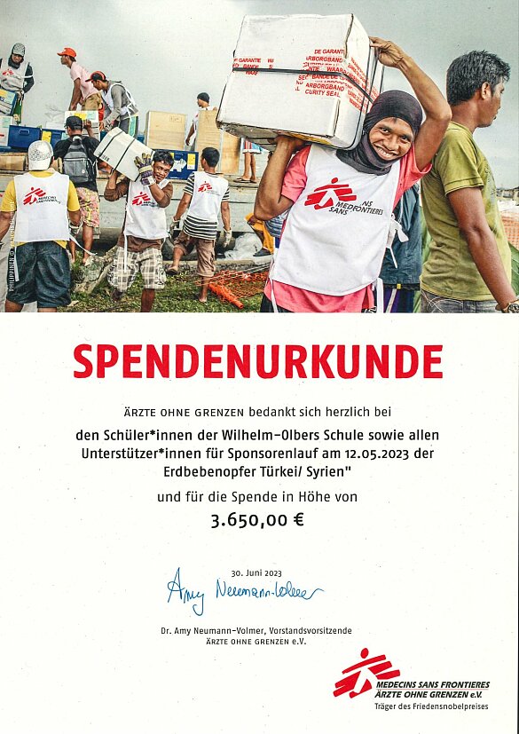 Am 12. Mai fand an der WOS ein Sponsorenlauf zugunsten der Erdbebenopfer in der Türkei und in Syrien statt. Insgesamt liefen 400 Schülerinnen und Schüler sowie einige Kolleginnen und Kollegen der Jahrgänge fünf bis sieben 2400 Runden, also über 900 km. Das ist eine sehr starke Leistung!