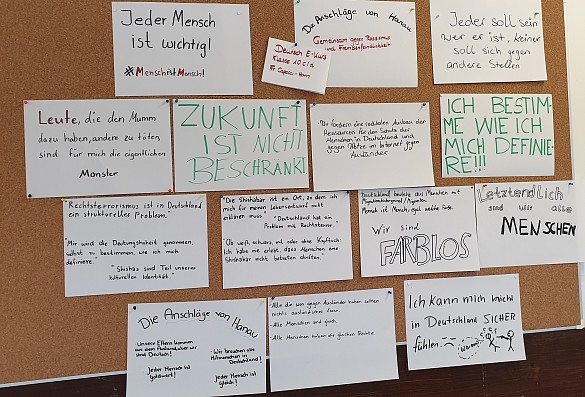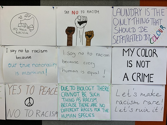 Die traurigen Ereignisse von Hanau bewegen uns alle, auch unsere Schülerschaft. Schülerinnen und Schüler einer 10. Klasse und der Oberstufe, haben sich intensiv mit den aktuellen Ereignissen auseinandergesetzt und Plakate gegen Rassismus erarbeitet.